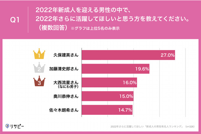 「Q1.2022年新成人を迎える男性の中で、2022年さらに活躍してほしいと思う方を教えてください。(複数回答)」(n=326)と質問したところ、「久保建英さん」が27.0%、「加藤清史郎さん」が19.6%、「大西流星さん(なにわ男子)」が16.0%という回答となりました。