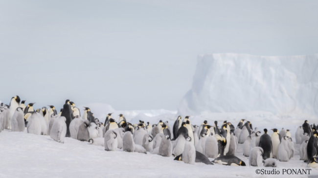 本上陸は、IAATO(国際南極旅行業協会)と南極条約加盟国による、環境と動物相を常に確実に保護するためのガイドラインに沿って実施されました。薄曇りの空の下、穏やかな海と美しい氷、小さな氷山に囲まれながら、探検チームは船から2海里(約5km)のハイキングで皇帝ペンギンのコロニーまで到達し、ヒナを含む1万羽以上の皇帝ペンギンに遭遇し、ポナンのゲストは真の自然のスペクタクルを体験しています。