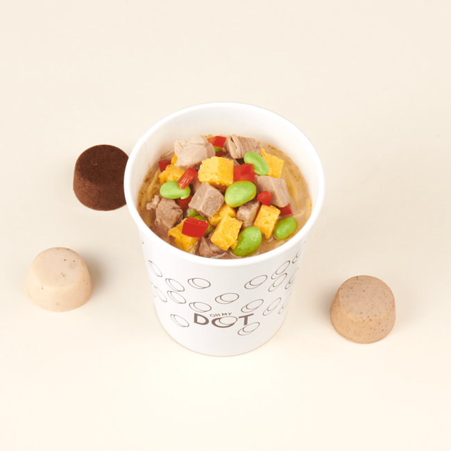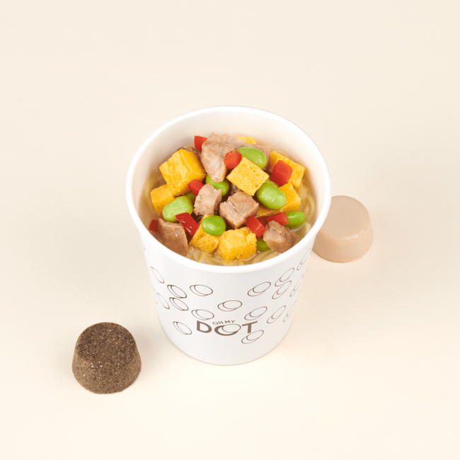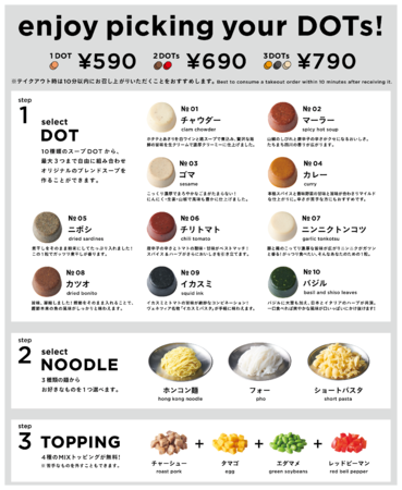 ■ “スープヌードル” 3つの新しいポイント1.スープとヌードル、両方主役の新ジャンル麺。自分好みが追求できる、誰でも食べやすいヌードルへ! 『oh my DOT』のヌードルは、麺もスープも両方主役の新カテゴリー麺です。好みに合わせて10種類のカラフルな“スープDOT”、3種類の麺を掛け合わせることで、525通り以上の組み合わせが可能です。これまで塩分やカロリーなどを気にして麺類を避けていた方にも食べやすいように、野菜や魚介など素材の旨みを活かした最後まで飲み切れるスープを目指しました。また、5種類のフレーバーオイルの中からお好みのオイルを加えることで、更なるカスタマイズも可能となります。ジャンルを超えて自分好みの味を追求できる、老若男女、誰でも食べやすいユニバーサルなヌードルを拡げていきます。