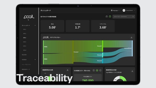 「pool」は、都市資源をデータ化し、回収効率を高めるとともに、リサイクル材料を活用したい製造業者と排出事業者を繋ぎ合わせ、サーキュラーサプライチェーンをデザインします。またリサイクル過程のトレーサビリティ情報とCO2排出量情報を提供し、企業のサステナビリティ戦略と法規制対応を支援します。