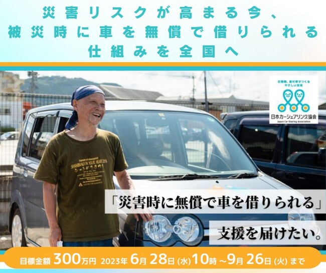 一般社団法人日本カーシェアリング協会(宮城県石巻市 代表理事:吉澤武彦、以下「協会」)は、6月28日(水)から9月26日(火)までの90日間、災害時に寄付車を一定期間無償で貸し出し、被災者の生活再建の後押しをする活動のためのクラウドファンディングを実施いたします。協会は現在、5月に発災した能登半島沖地震(石川県)、6月に発災した台風2号(愛知県、静岡県、茨城県)の被災地で車の無償貸出支援を実施しています。対応中の災害に加え、今後起こるであろう災害に対応するための資金調達、ならびにその体制をつくるためのクラウドファンディングです。