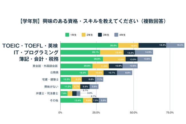 学別にみてみると、「宅建・建築士」と「弁護士・司法書士」を除き、すべての資格・スキルに対して大学1年生が他の学年の約2倍、興味が高い結果となった。