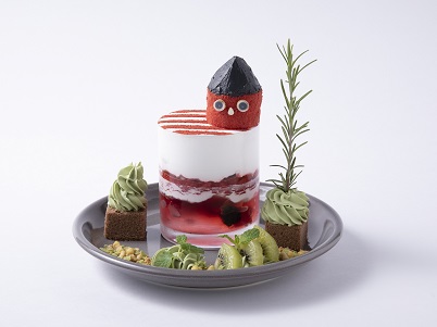 赤と白の楳図かずお邸を表現したパフェ。ガトーショコラや苺のパフェに、苺のロールケーキのお顔が