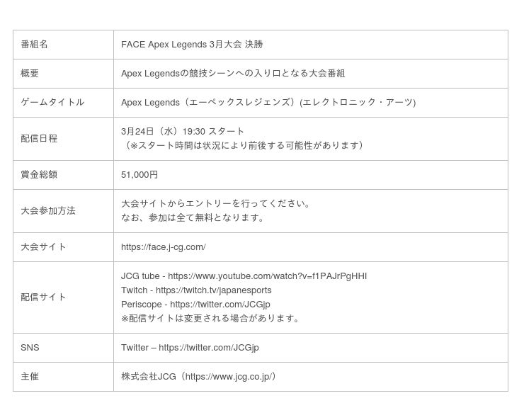 eスポーツのオンライン大会プラットフォームを提供する株式会社JCG(所在地:東京都品川区、代表取締役CEO:松本 順一)は、バトルロイヤルゲーム「Apex Legends(エーペックスレジェンズ)」(PC版)の定期オンライン大会「FACE」第1回大会の決勝番組を3月24日(水)19:30より配信します。