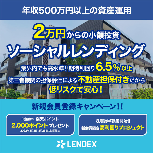 この度、ソーシャルレンディング投資サイト「LENDEX」を運営する株式会社LENDEX(本社:東京都渋谷、代表取締役:深澤克己)は、『新規投資家登録キャンペーン』を2022年8月8日(月)より開始し致しました。