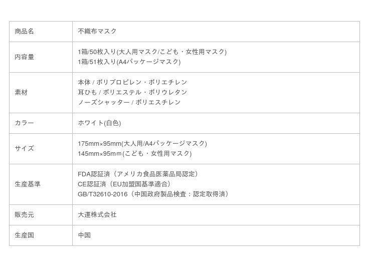 大運 株式会社(本社所在地:埼玉県川口市)は、高品質不織布マスクを安価でより多くの方にご使用いただくため、業界最安値水準の1箱(50枚)/370円で販売をしております。各国の品質基準(CE・FDA認証)をクリアし、証明書を取得した工場で品質・衛生管理を徹底しているため、安全にご利用いただけます。また、薬局・医療機関・企業に大量納品の実績がありますので、安心してご利用いただけます。コロナ渦のなか、感染予防と経済の両立に少しでも貢献できましたら、嬉しく思います。