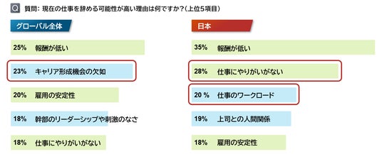 グローバルでは約半数の人が今の仕事に満足していますが、日本人は調査国中で最も低い満足度となりました。しかし、今後6か月以内に離職すると回答した割合も日本が最も低い結果となり、昨今、若年層を中心に「すぐ辞める」イメージがある一方で、グローバルとの比較ではそれほど雇用流動化が進展しているわけでもないことがわかりました。これには、離職を考えるきっかけとして「やりがいがない」「ワークロード(仕事量)」など消極的な項目が多い反面、「キャリア形成」といった積極的な理由が上位に来ない(グローバルでは2位)といった事情が影響していることが推察されます。