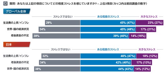ストレスを感じる要因として「インフレ」と回答した人はグローバル全体では前回調査より6ポイント低下し、2位の「世界や国の経済状況」も7ポイント減の結果となりました。一方、日本では、インフレが老後資金への不安も押し上げる形となり、「インフレ」が5ポイント増、「老後資金の不足」も6ポイント増えた結果となりました。