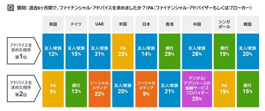 お金に関するアドバイスの入手先としてSNSがトップ2に入ったのは日本とUAEのみ