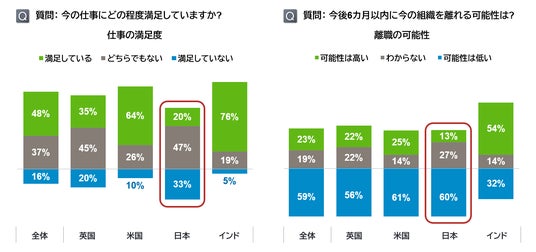 日本は仕事への満足度が調査国中で最も低いが、離職を考える割合も最も低い