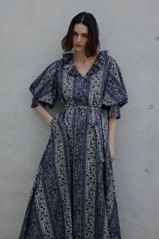 襟ぐりのフリルデザインとボリュームのあるバルーン袖がポイントのカシュクールドレス。