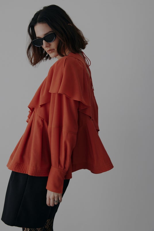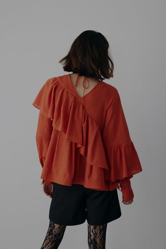 ボリュームのあるアシンメトリーなフリルデザインがポイントのブラウス。