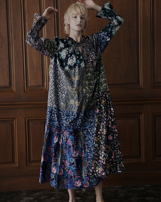 リバティ社が得意とする繊細な柄をパッチワークで組み合わせたドレス。