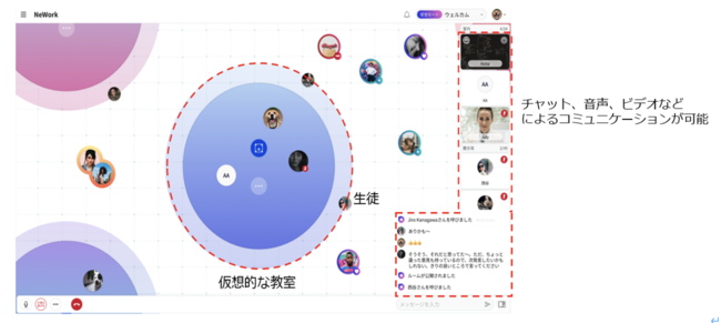 「バーチャル教室」とは、「フレンドリーオンライン」に参加する児童生徒がオンライン上で自由にコミュニケーション可能な空間です。集団生活への慣れやコミュニケーションに対する児童生徒の不安軽減を目的としています。「バーチャル教室」は、NTT Comが提供するオンラインワークスペース「NeWork(R)」を活用し実現しており、円状の仮想的な教室に入室した児童生徒間でチャット、音声、ビデオなどによるコミュニケーションが可能です。