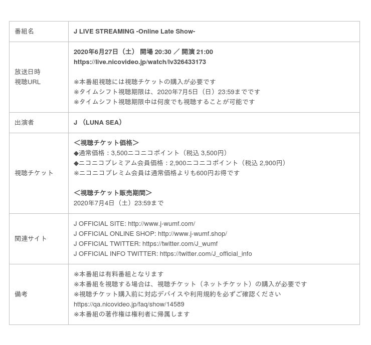 ニコニコ生放送では、6月27日(土)21:00より、『J LIVE STREAMING -Online Late Show-』と題し、LUNA SEA ベーシストJ が自身初の試みとなる無観客ライヴ配信を独占生中継します。
