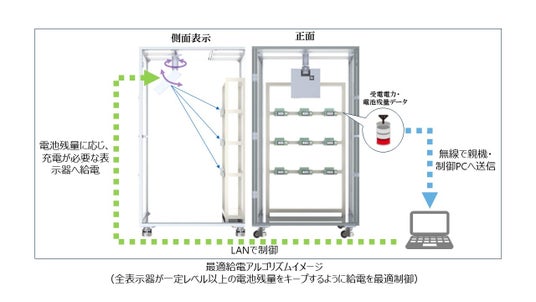 今般、多数の表示器を使用するアイオイシステムの「デジタルピッキングシステム」において、アイオイシステムはマイクロ波給電の受電機能を搭載した表示器を製作し、東芝インフラシステムズは高利得アンテナをメカニカルに制御する給電装置を用い、両社で安価なシステムの構築に成功しました。本システムは、東芝インフラシステムズの独自技術により電池残量が分かるとともに、最適給電アルゴリズムの適用により複数の表示器を効率よく給電することが可能です。両社は、2023年8月に送電機と表示器(受電器)35台を用いた給電実証を実施し、送電機から全表示器に無線電力伝送ができたことを確認し、本技術の有効性を実証しました。