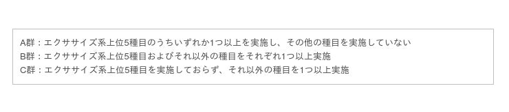 感染拡大後(2020年2月~2021年1月)の運動・スポーツ実施率は、感染拡大前A群が72.7%、B群90.0%、C群72.2%という結果で、エクササイズを含む多様な種目を実施しているB群において、運動・スポーツの継続実施率が高かった。日常化しやすいエクササイズ種目に加えて、その他の種目を行うことが、運動・スポーツ習慣の継続に効果的であることが示唆される。