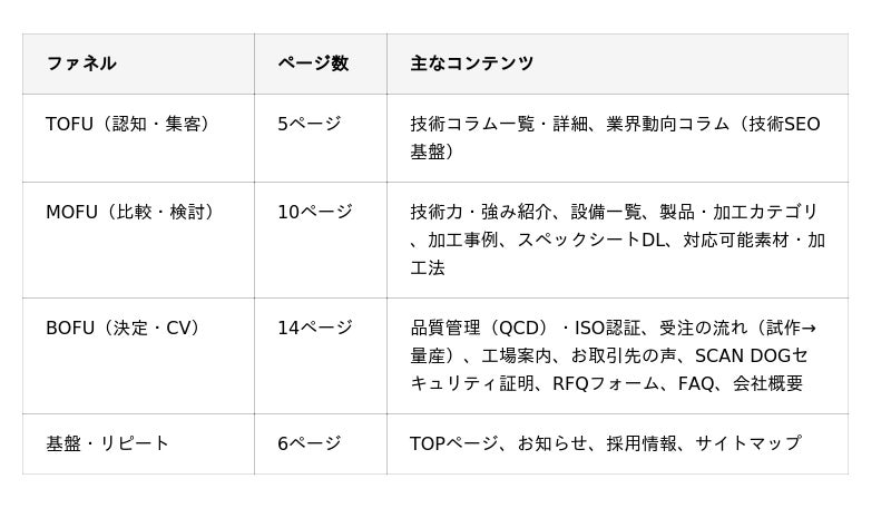 SCSC Factoryの35ページは、製造業の購買心理に完全対応したTOFU→MOFU→BOFUの3層構造で設計されています。
