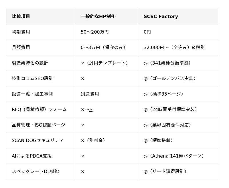 ■ 徹底比較 ── 一般的なHP制作 vs SCSC Factory