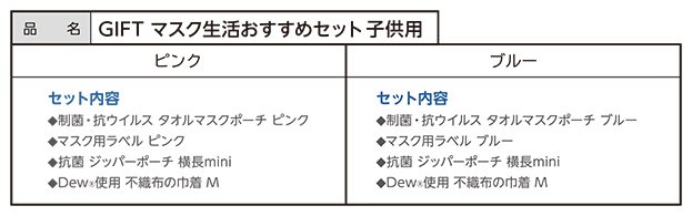 幼稚園や学校でのマスクの名前つけや予備マスク入れ、給食や体育でマスクを外す時の保管用にとマスク生活を快適に過ごせる商品を取り揃えたギフトセットです。