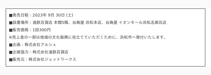 株式会社アルシェ(代表取締役社長:中島祥雄)と株式会社ジェットワークス(代表取締役:荒地功一)は、株式会社遠鉄百貨店(代表取締役:後藤毅彦)との企画協力により、「浜松ガチャタマ」第一弾を発売することになりました。