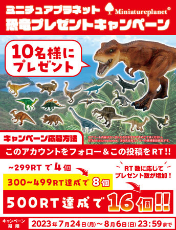 (https://twitter.com/Miniatureplanet)をフォロー+対象ツイートをリツイートした方の中から抽選で10名様に「Miniatureplanet(ミニチュアプラネット)恐竜フィギュア」をプレゼント。