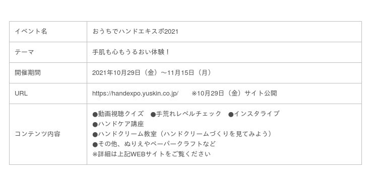 ユースキン製薬株式会社(本社/神奈川県川崎市 代表/野渡和義)は、2000年に11月10日を「いい手(いいテン)の日=ハンドクリームの日」として日本記念日協会に登録し、毎年11月10日前後にハンドケアの大切さを伝えるイベント「ハンドエキスポ」を開催しています。今年は「おうちでハンドエキスポ2021」と題して、オンラインで開催いたします。