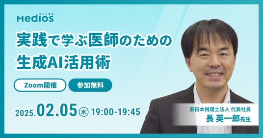 実践で学ぶ医師のための生成AI活用術無料生成AIツールを用いて医療現場での業務や論文作成などに役立つ活用方法を公認会計士/税理士で「医療のための生成AIガイド」の著者でもある長 栄一郎先生から実演いただくセミナーを開催します。どうぞお気軽にご参加ください。