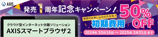 株式会社アクシス(東京都中野区、代表取締役 宮腰 行生、以下「アクシス」)は、クラウド型インターネット分離セキュリティソリューション「AXISスマートブラウザ2」の発売1周年を記念して、初期費用50%OFFキャンペーンを実施します。