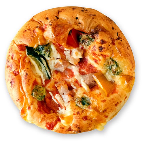 彩りサマーピザトマトソース、バジルドレッシング・ベーコン・グリル野菜をトッピング。暑い季節にも食べやすくボリュームのあるピザパンです。