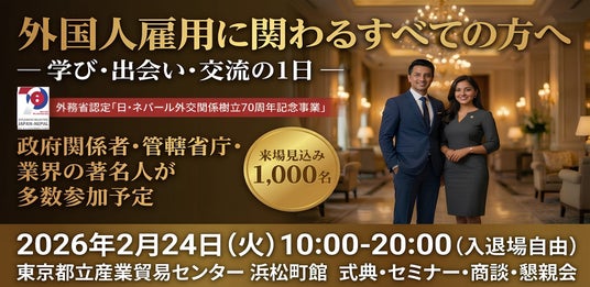 一般社団法人外国人雇用協議会(所在地:東京都港区、代表理事:原 英史)は、2026年2月24日(火)、東京都立産業貿易センター浜松町館にて「第2回 日本・ネパール雇用カンファレンス」を開催いたします。本カンファレンスは、外務省より「日・ネパール外交関係樹立70周年記念事業」として認定を受けた公式事業です。日本とネパール連邦民主共和国における雇用・人材交流のさらなる発展および持続的な協力関係の強化を目的としており、両国の政府関係者、送り出し機関、民間企業が一堂に会する、国内のネパール関連イベントとしては過去最大規模の開催となります。