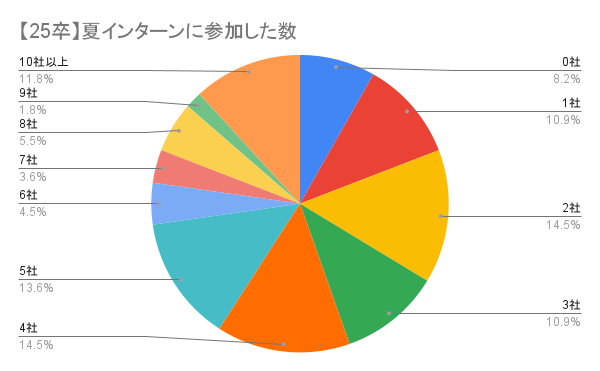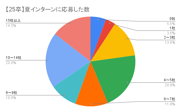 夏インターンの平均応募数は7.66社でした。人によって、応募する数にバラつきがあるとはいえ、多くの数を応募していることが分かりました。