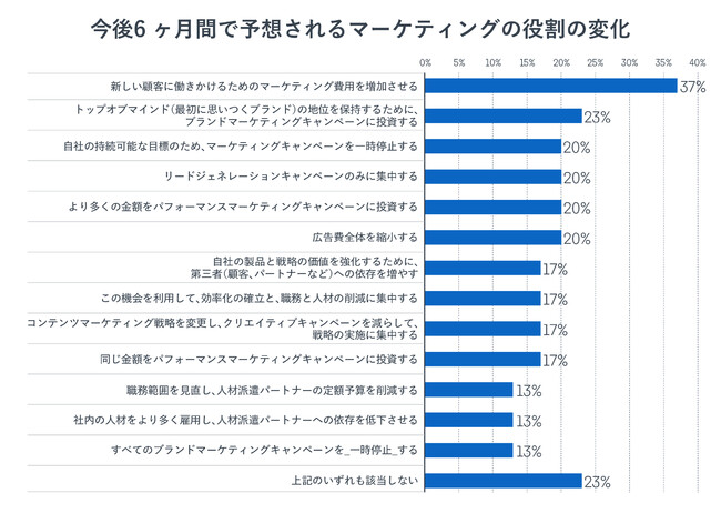 経済の先行き不透明感が強まる中で、今後6ヶ月のマーケティングの役割として予想される変化について聞いたところ、日本では「新しい顧客に働きかけるためのマーケティング費用を増加させる」が37%と最も多く挙げられ、「トップオブマインド(最初に思いつくブランド)の地位を保持するために、ブランドマーケティングキャンペーンに投資する」が23%と続きました。このことから、日本の経営幹部は、現在の経済環境下においてもマーケティング投資に意欲的であることが伺えます。