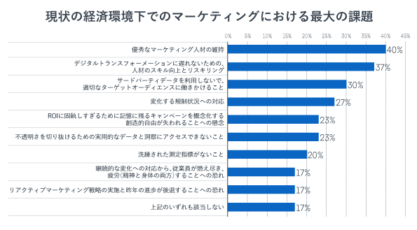 最後に、現在の経済環境下でのマーケティングにおける最大の課題が何かを聞いたところ、日本では「優秀なマーケティング人材の維持」が40%と最も多く、「デジタルトランフォーメーションに遅れないための人材のスキル向上・リスキリング」が37%と続きました。日本の経営幹部が、マーケティング人材の確保とリスキリングを課題と感じていることが、ここから伺えます。