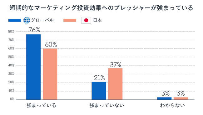 調査では、経済の先行き不透明感が強まる中で、短期間でマーケティングキャンペーンの投資収益率(ROI)を向上させることへのプレッシャーが強まっているかについて質問しました。すると、日本では回答者の60%が「強まっている」と回答。「強まっていない」とした37%を大きく上回りました。なお、世界全体では「強まっている」と回答した割合が76%に上り、世界的に経営幹部は、マーケティング活動についてより短期的な結果が求められていると感じていることが伺えます。