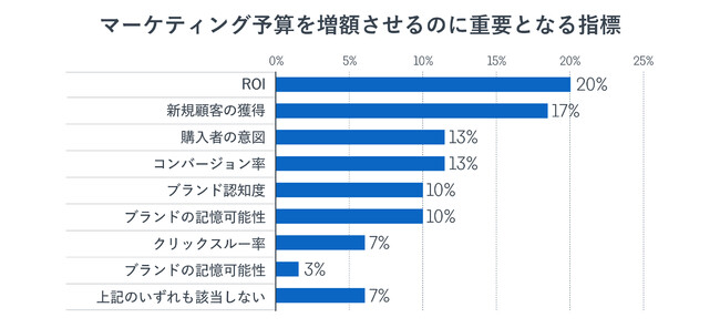 また、マーケティングの予算を増額させるために現在最も重要な指標は何かという質問では、日本では「投資収益率(ROI)」が20%と最も多く、「新規顧客の獲得」(17%)、「購入者の意図(顧客が製品またはサービスに、いつ、どうして関心を持つかの理解)」(13%)「コンバージョン率」(13%)と続きました。