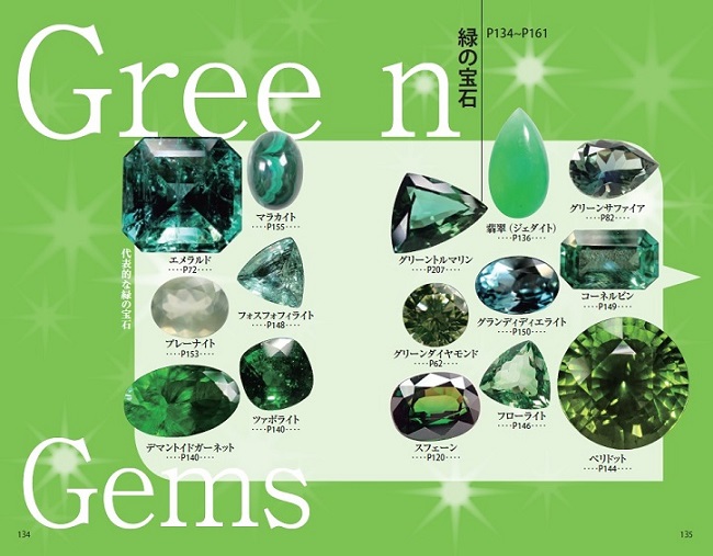 それぞれの始まりには、その色合いの代表的な宝石が一覧で分かる扉ページをつけています。