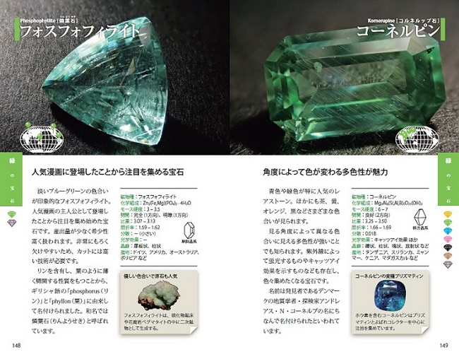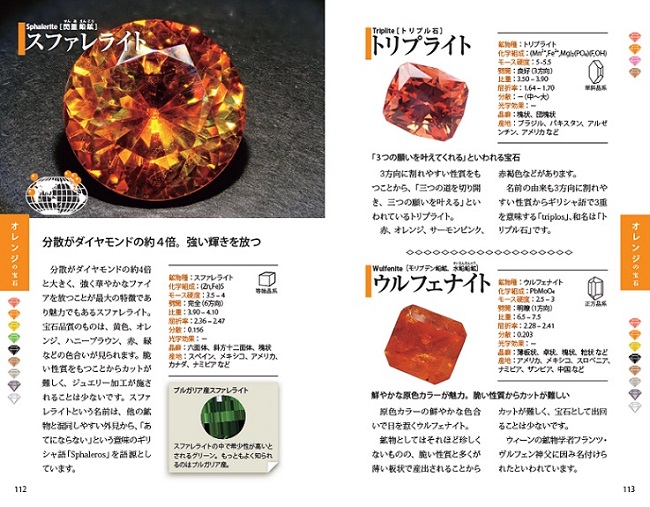 各宝石の基本データ、詳解などのほか、ダイヤモンド、エメラルド、サファイア、ルビーの四大宝石については、産地別特徴や誕生する場所、世界の有名宝石などの情報も掲載。
