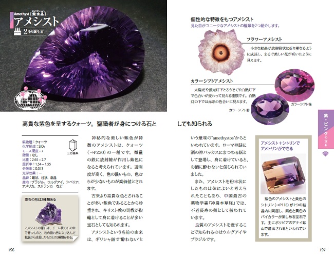 誕生石に選ばれたり、古くから広く使われ、馴染み深い宝石から、通常あまり見たり聞いたりしないような超稀少石、マンガや小説に登場し、注目をあびた宝石など、実に300種類超えの宝石を画像をふんだんに使って紹介。