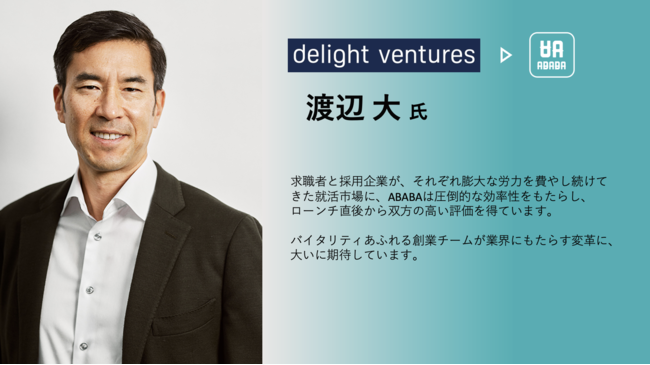 株式会社ABABA(本社:大阪府吹田市、代表取締役:久保駿貴、中井達也)が提供する新卒対象スカウト型サービス「ABABA」はリリース2年で600社を超えるユーザー企業、ほぼクチコミのみで15,000名を超える就活生に利用いただくサービスにまで急成長いたしました。その結果、企業から就活生に向けた25万通ものスカウトが生まれています。そして今回、プレシリーズAラウンドにてデライト・ベンチャーズ、NESベンチャーキャピタル、広島ベンチャーキャピタルによる第三者割当増資で1.2億円の資金調達を実施しました。2022年2月に発表した資金調達と合計し、これまでの総調達額は約2億円となります。今回調達した資金は、「ABABA」の更なる成長を目的とした新規事業創出およびマーケティング、人材採用に活用いたします。