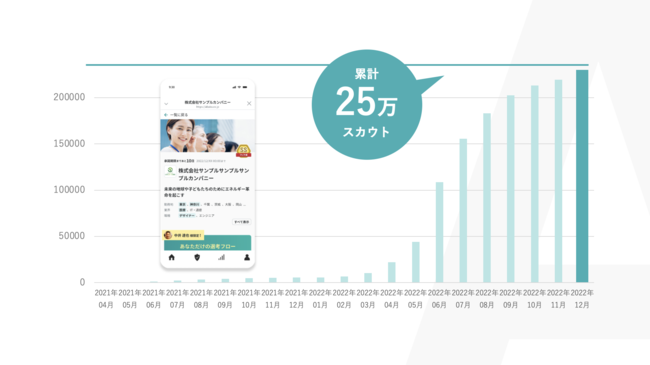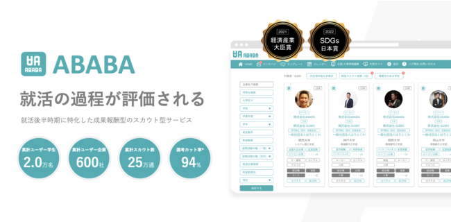 コロナ禍の2020年11月にリリースした、就職活動の過程が評価されてスカウトが届く「ABABA」では、ユーザー企業から就活生に届けられたスカウト数が25万通を突破し、加速度的な成長を続けています。(前年比 +4,500%増)