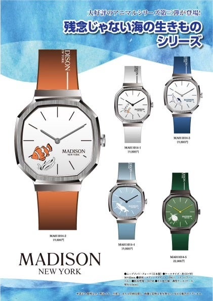 ニューヨーク発のコンテンポラリー・ウォッチブランド『MADISON NEW YORK (マディソン・ニューヨーク)』の日本総発売元を務める株式会社ミスズ(本社:東京都杉並区、代表取締役社長:半田晴久)は、新シリーズ【残念じゃない海の生きものシリーズ】を発売します。