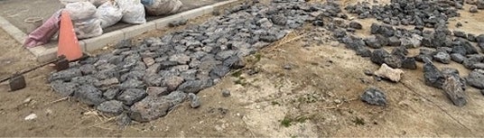 ONOONOグラウンドは、粘土質のため、水はけが悪いことが課題でした。2メートル程掘ったところに杭を打ち、藁とグリ石を交互に敷き詰めることで、排水性の高い石畳をつくりあげました。