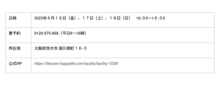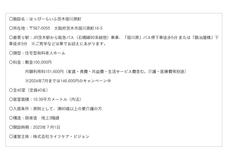 大阪府を中心に有料ホーム「はっぴーらいふ」シリーズを運営する株式会社ライフケア・ビジョン(大阪市 代表取締役 祝嶺良太)はこの度、2023年7月に大阪府茨木市にて住宅型有料老人ホーム「はっぴーらいふ茨木宿川原町」(大阪府茨木市宿川原町16-3)を開設します。
