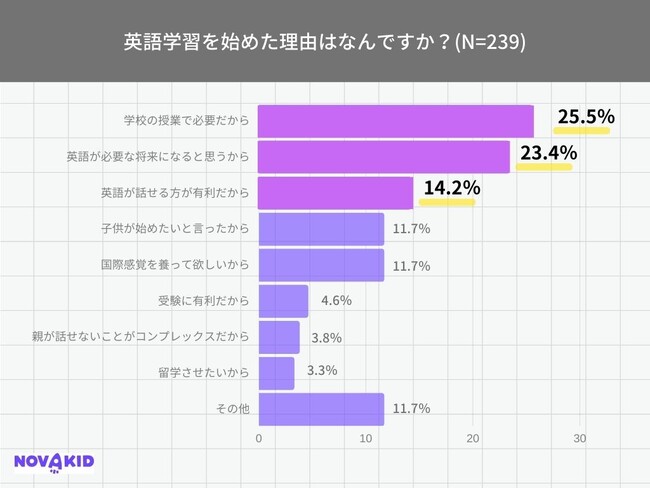 「英語学習を始めた理由はなんですか?」(n=239)という質問をしたところ、25%が「学校の授業に必要だから」と回答、ほぼ同数の23%が「英語が必要な将来になると思うから」という回答結果になりました。また14%が「話せる方が有利だから」と、将来に向けた学習であると回答しました。「子どもが始めたいと言ったから」という回答は11%で、子ども自身が英語に興味関心があることもうかがえます。