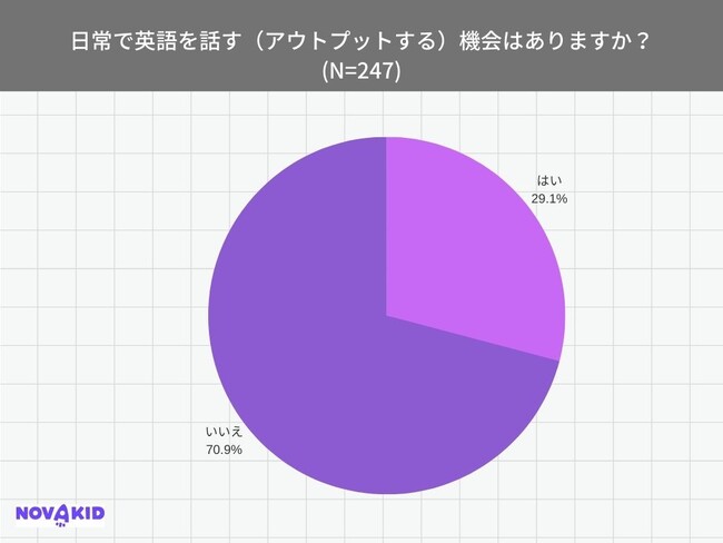 「日常で英語を話す(アウトプットする)機会はありますか?」(n=247)という質問をしたところ、70.9%が「いいえ」と回答。「英語を話す機会が必要」という上記の回答を受け、話す機会が重要だと考えながらも、普段の生活では英語を使う機会がないことが分かりました。