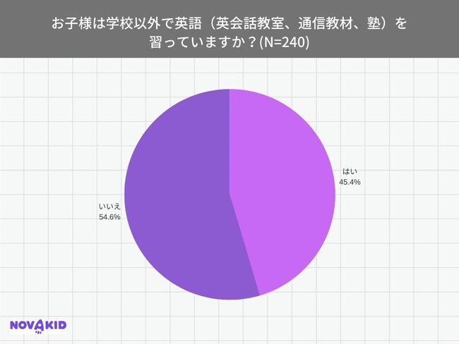 「学校以外で英語(英会話教室、通信教材、塾)を習っていますか?」(n=240)という質問したところ、54.6%が「いいえ」と答えたのに対し、45.4%が「はい」という回答結果になりました。