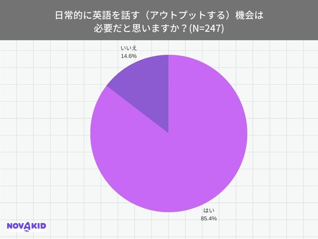 「日常的に英語を話す(アウトプットする)機会は必要だと思いますか?」(n=247)という質問をしたところ、85.4%が「はい」と回答しました。英語をアウトプットする機会がないが、もっとアウトプットさせたいという保護者の意向が表れました。