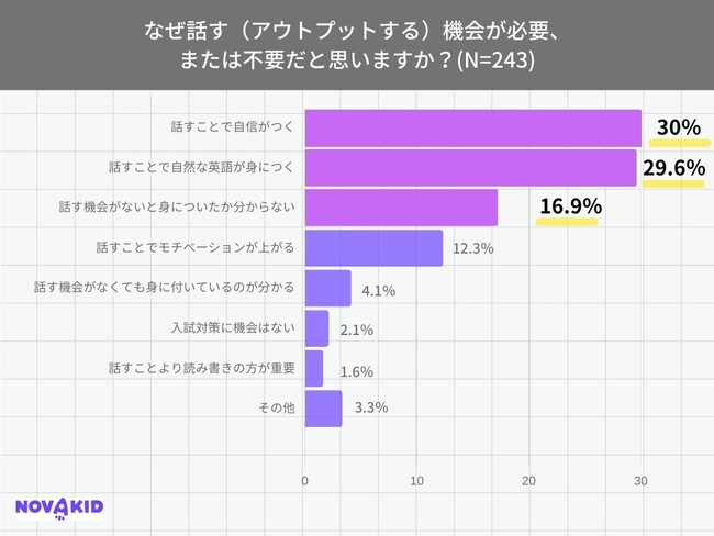 「なぜ話す(アウトプットする)機会が必要、または不要だと思いますか?」(n=243)という質問をしたところ、「話すことで自信がつく」と回答し、次いでほぼ同数の29.6%が「話すことで自然な英語が身に付く」と回答しました。また「話す機会がないと身についたか分からない」が16.9%で英語学習をしていても、日常の中で英語に触れる機会が少なく、英語が身についているか不安を感じている保護者も多いことが分かります。
