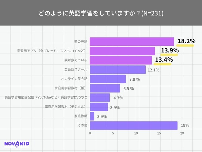 「どのように英語学習をしていますか?」(n=231)という質問をしたところ、「塾の英語」18.2%、次に「学習用アプリ(タブレット、スマホ、PCなど)」が13.9%、「親が教えている」がほぼ同数の13.4%という回答結果になりました。デジタル教材の普及により、自宅で英語学習をする家庭が多いことが分かります。また「英会話スクール」は12.1%に留まり、コロナ渦で一気に注目された「オンライン英会話」は7.8%でした。